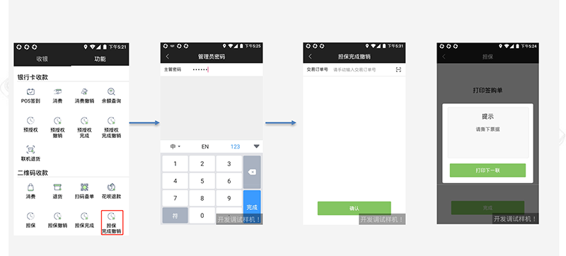 1、收银台进入“功能”列表, 点击机担保完成 2、输入管理员密码 3、输入小票上的订单号以及 完成金额 4、担保完成交易
