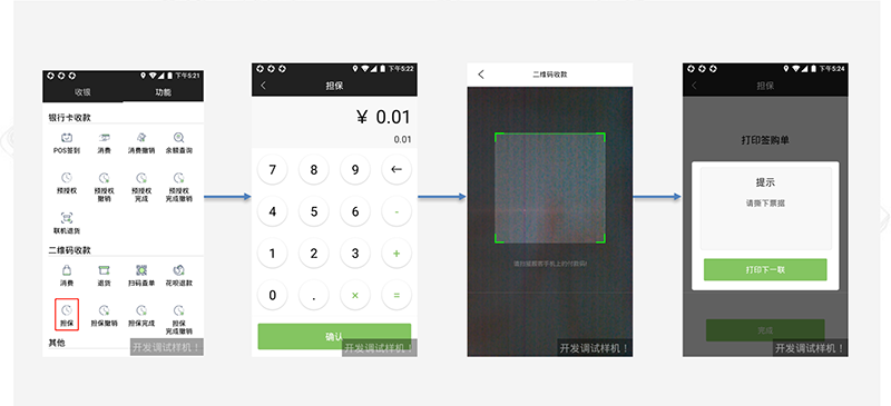 1、收银台进入“功能”列表, 点击担保 2、输入担保金额 3、扫码微信/支付宝付款码 4、担保交易完成