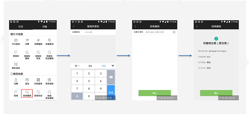 1、收银台进入“功能”列表, 点击机担保完成撤销。 2、输入管理员密码 3、输入小票上的订单号以及 完成金额 4、担保完成撤销交易